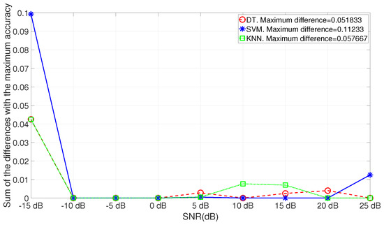 The adaptive curve shown in Figure 11 is obtained using the DT algorithm to choose the MWs. In this study, we have also used the SVM and KNN algorithms. Then, it is interesting to evaluate the related performance of the three algorithms. The results are shown in Figure 12 where the differences between the ground truth (the optimal accuracy among all the approaches) and the value of the accuracy obtained for the MW obtained by the ML algorithm is shown for each value of SNR in dB and for all the three ML algorithms.