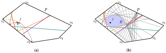 Assuming that the polygon P is fixed, the number of arcs of the safe region depends on the focus f. We denote explicitly by a safe region with point f as its focus. As in [4], this section analyzes the number of arcs of safe region , i.e., , where is the set of arcs of . Figure 8a shows two safe regions with query point and with query point .