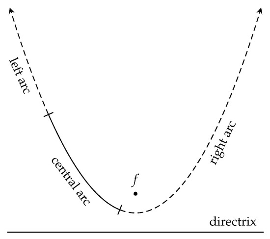 where each arc is a 3-tuple which keeps a reference to the parabola , its left endpoint , and its right endpoint . We note that with this representation, for , and . We also note that, using the notation defined in Section 2.2, is and is .