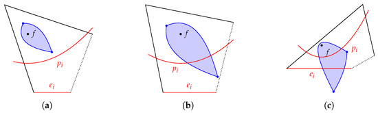 Algorithm 1 uses the following subroutines. Subroutine creates a representation of a parabola with f as its focus and a line extension of edge e as its directrix. Subroutine computes the intersection point of parabola and ; we recall that from Lemma 2, there are two intersection points and this subroutine returns the “inner” one, i.e., , not .
