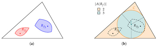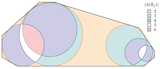 Figure 10 shows an application of Theorem 2. The event circles are shown with their intersections. From Theorem 2, for each point f, the number of arcs of depends on the number of edges tangent to event circles containing f. Thus, every point f in a particular intersection of event circles has the same value of . Each intersection in Figure 10 is shown with a different color depending on the value of for a query point f inside it. Remark again that for query point f in the area outside any event circles, the value of is 2.