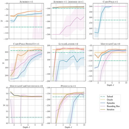 Figure 2 shows our main result: For all environments and all presented algorithms, we plot the return as a function of DT depth d. ITER usually reaches the solved-threshold (dash-dotted green line) at lower depths than the other two algorithms. It is the only one to solve all investigated environments (at depths up to 10). For each environment, we select one of the successful DRL agents (see Table 2).