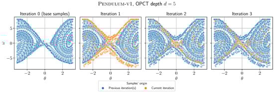 Evolution of the training dataset with iterations for OPCT of depth 5 for Pendulum (observables mapped back to 2D). The plots show from left to right the observations added to the dataset in each iteration (by the oracle in iteration 0 and by the tree in iterations 1–3).