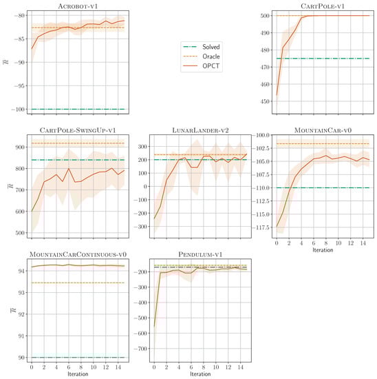Evolution of OPCT performance with iterations. Shown are mean of 10 repetitions. Generally, the return increases notably in the first few iterations. For most environments, a significant improvement after 10 iterations is not observed. (The OPCTs’ depths are chosen according to Table 2a.)