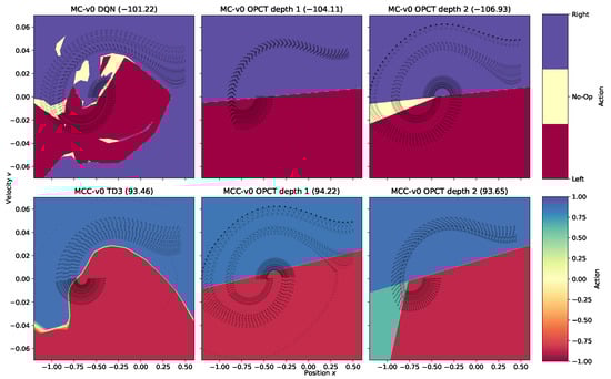 Two-dimensional observation spaces offer the possibility of visual inspection of the agents’ decision-making. This can provide additional insights and offer explanations of bad results in certain settings. Figure 5 shows the decision surfaces of DRL agents and OPCTs for MountainCar in the discrete (top row) and continuous (bottom row) versions. DRL agents can often learn a needlessly complicated partitioning of the observation space, as can be seen prominently in the top left plot, e.g., by yellow patches of “no-acceleration” in the upper left or the blue “accelerate right” area in the bottom right, which are never visited by oracle episodes. This poses a problem for the BB algorithm because it samples, e.g., from the blue bottom right area and therefore, DTs learn in part “wrong” actions, resulting in poor performance. Thus, the inspection of the oracle’s decision space reveals the reason for the partial failure of the BB algorithm in the case of MountainCar at low depths.