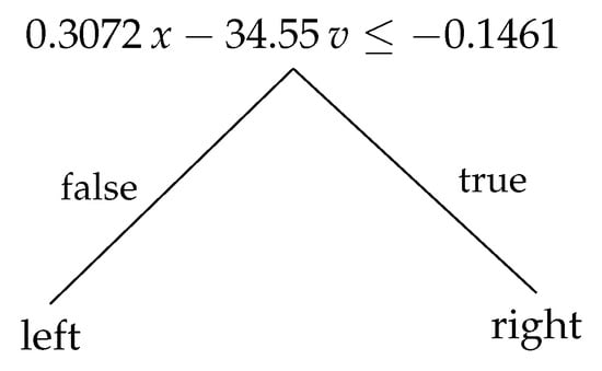 For the training of DTs, we rely on two algorithms representing two “families” of DTs: The widely-used Classification and Regression Trees (CARTs) as described by Breiman et al. [27] and implemented in [28] partition the observation space with axis-parallel splits. The decision rules use only one observable at a time, which makes them particularly easy to interpret. On the other hand, Oblique Predictive Clustering Trees (OPCTs), as described and implemented in [29], can generate DTs where each decision rule compares the weighted sum of the features to a threshold :