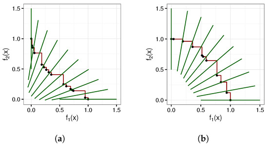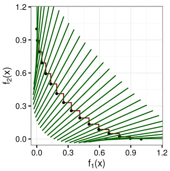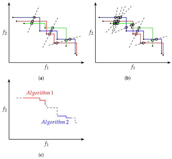 For stochastic algorithms, variations in the performance over multiple runs (also referred to as samples) are expected. Fonseca and Fleming [1] described a procedure to generate an attainment surface that represents a given algorithm’s performance over multiple independent runs. The attainment surface for multiple independent runs is computed by first determining the attainment surface for each run’s approximated POF. Next, a number of random imaginary lines is chosen, pointing in the direction of improvement for all the objectives. For each line, the points of intersection with each of the lines and the attainment surfaces are calculated. Figure 2a,b depict three attainment surfaces with intersection lines and intersection points.