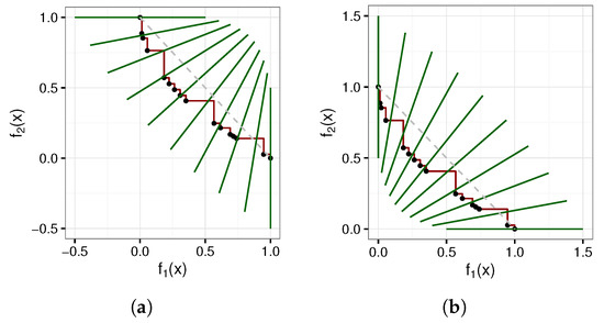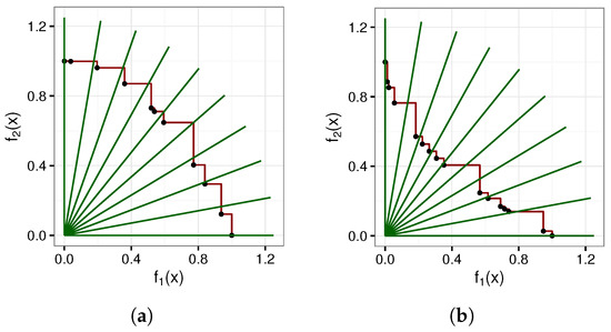 Figure 3 depicts two example attainment surfaces with rotation-based intersection lines. Figure 3a depicts a concave attainment surface. Visually, the rotation-based intersection lines look to be equally distributed. Figure 3b, however, depicts a convex attainment surface. Visually, the length of the attainment surface between the intersection lines is larger in the regions closer to the objective axis than in the middle regions. Clearly, the rotation-based intersection lines are not equally spaced for convex-shaped fronts when comparing the length of the attainment surface represented by each intersection line.