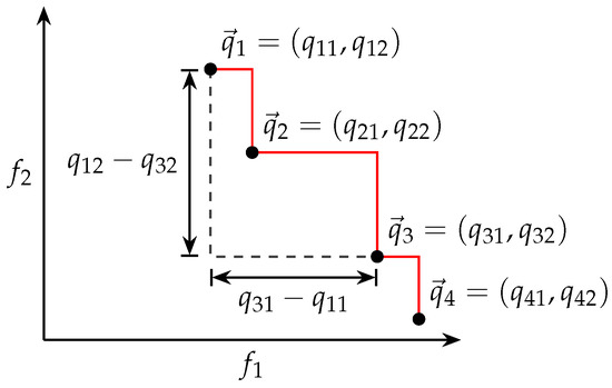 An alternative approach, referred to as attainment-surface-shaped intersection lines (ASSIL) in this paper, is to generate the intersection lines along the shape of the attainment surface. In order to equally spread the intersection lines, the Manhattan distance is used to calculate equal spacings for the intersection lines along the attainment surface. Figure 5 depicts the Manhattan distance calculation between two points on the approximated POF, which is and in this case. ASSIL can be generated using Algorithm 1.