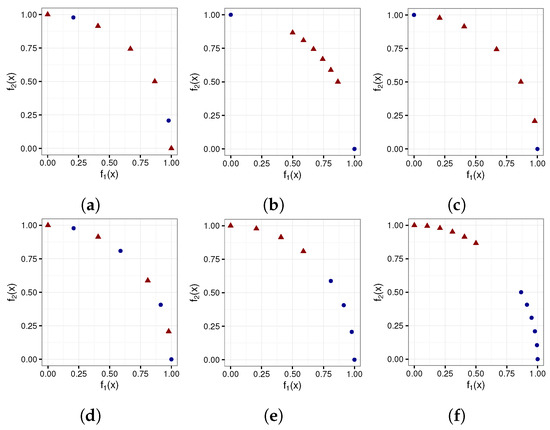 Test case Pareto-optimal fronts. Dots represent algorithm A, and triangles represent algorithm B. (a) Case 1. (b) Case 2. (c) Case 3. (d) Case 4. (e) Case 5. (f) Case 6.