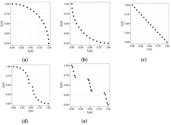 Test case Pareto-optimal front geometries. (a) Concave. (b) Convex. (c) Linear. (d) Mixed. (e) Disconnected.