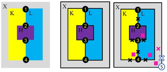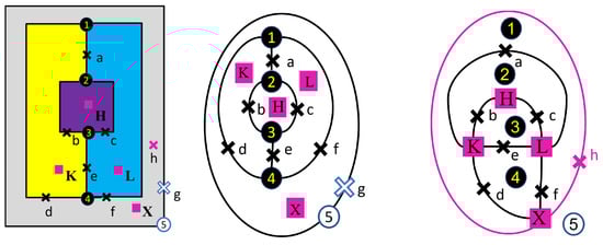 Figure 2, right, draws the two-, one- and zero-dimensional homological representative elements of this image, given by squares, crosses and circles, respectively. Note that the region X has a hole, and a 1-dimensional element colored as a pink cross is added to differentiate it from the other 1-dimensional frontier’s representatives. Likewise, the most external frontier presents a hole; thus, a 0-dimensional representative (marked as 5) must appear.