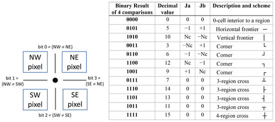 Clearly, can be computed via the table T; it is the total number of crosses with three or four pixels with different attributes (here described as and , respectively) plus the number of holes composed of only one frontier (called in this work because the southeast-most 0-cell representative of any of these holes has only two cobounds).