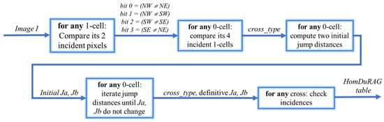 Note that the “do…while” loop of the algorithm has been written in an identical and independent way for any 0-cell, and no carry ahead dependencies among iterations exist, thus facilitating its parallelization by simply dividing the matrices into disjoint sets of pieces. Only the variable that counts crosses and holes in Steps 7.a, 7.b and 7.c would imply the need of a different counter for each processing element (such as CPU or GPU cores).