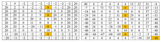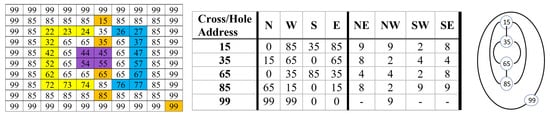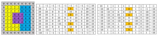 at the end of two iterations: the first and last iterations (Iteration 5). During each iteration, jump distances are exponentially increased if no cross is reached. In our example and at the end of the first iteration, most 0-cells have doubled in distance (obvious for values, −2, 2, −20, and 20 and for −9, 9, −11, and 11 which mean that a row and column hop has been chosen). Only