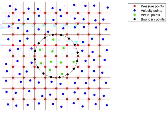 As illustrated in Figure 1, the pressure Poisson equation is solved in a rectangular domain (shown here as a square for convenience) discretised by uniformly distributed points (marked as red in the figure and, hereafter, called the pressure points) and the real flow domain is discretised by irregularly distributed points (marked as blue in the figure and, hereafter, called the velocity points). Like in the immersed boundary method [37], a solid obstacle (here, a cylinder marked by the black circle with its boundary discretised by the boundary points in black) is treated as an immersed body filled with a frozen fluid; hence, the flow field extends effectively to the whole rectangular domain with the incompressibility holding everywhere and the no-slip condition enforced at the immersed boundary (IB). To perform the divergence calculations for the right-hand side of the pressure Poisson equation, additional points inside the IB are introduced (marked as green in the figure and, hereafter, called the virtual points). At the boundary points, the intermediate velocities are calculated in the same way as that for the velocity points, while at the virtual points, they were set to zero so that the velocity field inside the IB is already divergence-free.