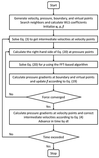 The whole simulation procedure for the projection method based on the hybrid pressure-correction algorithm is summarised by the flow chart shown in Figure 2.