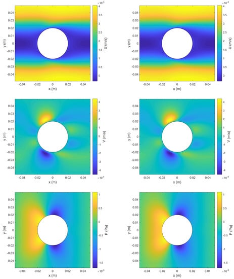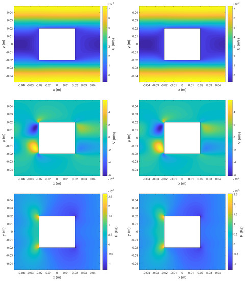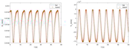 To further verify the correctness of the two methods above, the flow problem here was also simulated by using the commercial CFD software ANSYS Fluent. The spatial discretisation was performed by the standard finite volume method, and the time integration was performed by a second-order implicit scheme. The results obtained by ANSYS Fluent are not shown because they visually overlapped with those obtained by the hybrid and reference methods. The relative differences between the hybrid and Fluent solutions of U, V, and P were , , and , respectively. The relative differences between the reference and Fluent solutions of U, V, and P were , , and , respectively.