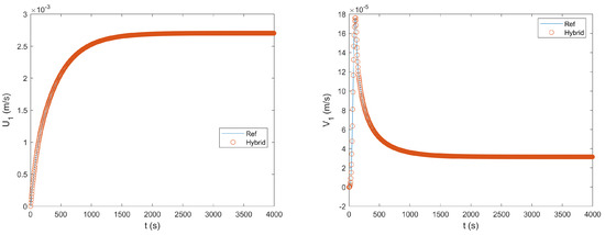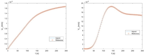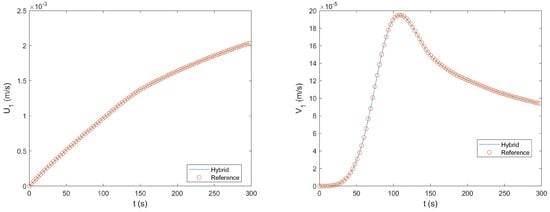 Figure 4 compares numerical solutions at obtained by the two methods for the horizontal velocity component U, the vertical velocity component V, and the pressure P. From a direct visual comparison, all these results showed excellent agreement between the solutions obtained by the hybrid method and the reference method. For a quantitative comparison, the relative difference for a flow variable between the two numerical solutions was computed as the root-mean-squared difference normalised by the root-mean-squared value of the variable from the reference solution. For the steady-state results, the relative differences for U, V, and P were , , and , respectively.