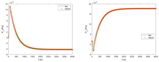 Comparison of time histories of the pressure at the two monitoring points 1 and 2 obtained by the reference method and the hybrid method for the fourth test case.