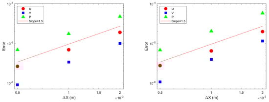 Figure 7 shows the log–log plot of the errors as a function of the grid size for the horizontal velocity component U, the vertical velocity component V, and the pressure P. As indicated by the fit slope, the convergence rates for those flow variables were around 1.5. Therefore, for both the hybrid and reference methods, the spatial order of accuracy was lower than second order, although the spatial discretisation was based on the second-order Taylor’s expansion. It is reasonable to infer that the loss of accuracy was due to the WLS approximation.