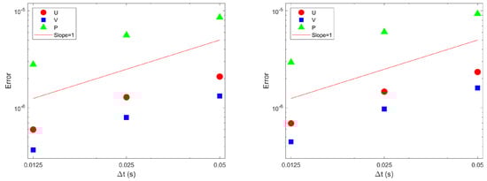 Figure 8 shows the log–log plot of the errors as a function of the time step for the horizontal velocity component U, the vertical velocity component V, and the pressure P. As indicated by the fit slope, the temporal convergence rates for those flow variables were around 1. Therefore, for both the hybrid and reference methods, the temporal order of the accuracy was first order. This is consistent with the observation made by Aithal and Ferrante [21]: “We have observed that, in the presence of a no-slip wall, the numerically stiff viscous-diffusion term in the momentum equation of the incompressible Navier–Stokes equations causes loss of accuracy when integrated in time using the second-order Adams Bashforth method, and, in turn, the resulting solution for velocity is only first-order accurate in time”.