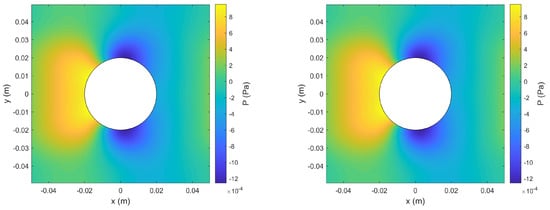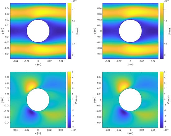 In the third numerical example, laminar flow past a cylinder between two parallel plates was simulated using the proposed hybrid method, and the results were compared with those obtained by the reference method. The geometry of the problem was the same as that shown in Figure 9. The flow was driven by a body force along the horizontal direction. Periodic boundary conditions were applied in the horizontal direction. No-slip boundary conditions were imposed at the top and bottom boundaries and the wall of the cylinder. For solving the pressure Poisson equation in the hybrid method, it can be shown that, with the staggered grid and central difference scheme, at the top and bottom boundaries cancelled out in the final algebraic equations for the pressures at the internal grid points; therefore, their values can be effectively set to zero for the calculations in which they are involved. This justifies the use of the Neumann boundary condition specified by Equation (7) at the top and bottom wall boundaries, and consequently the application of the FFT-based solver. If needed, the pressures on the top and bottom boundaries can be calculated using Equation (8) with the values of as they are. It is worth mentioning that the IB force was not applied at a boundary where the Neumann boundary condition was imposed. The velocity field was initialised with zero values everywhere. The reference pressure is set to zero at the left-bottom corner. The geometric and physical parameters were the same as those of the second test case. With this setting, the maximum horizontal velocity can reach about eventually. Based on , r, and , the Reynolds number of the flow simulated here was about .