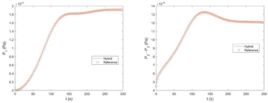 Comparison of the time histories of the pressure at Monitoring Point 1 and the pressure difference between the two monitoring points 2 and 3 obtained by the reference method and the hybrid method for the second test case.