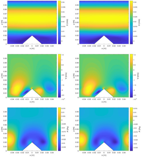 Comparison of numerical solutions obtained by the reference method (left) and the hybrid method (right) for the first test case at s. Shown from top to bottom are the contours of the horizontal velocity component U, the vertical velocity component V, and the pressure P, respectively.
