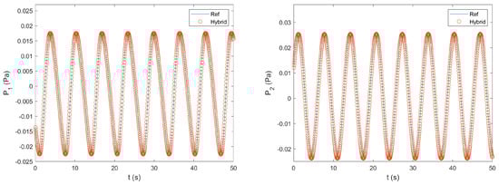 Figure 17 compares numerical solutions at a given time obtained by the two methods for the horizontal velocity component U, the vertical velocity component V, and the pressure P. Figure 18 and Figure 19 show the time histories of U, V, and P at the selected monitoring points indicated in Figure 16. It can be seen that the flow was periodic in time. Like in the previous test cases, all these results showed excellent agreement between the solution of the hybrid method and that of the reference method. The relative differences for U, V, and P were , , and , respectively. The relative differences for , , , and were , , , and , respectively.