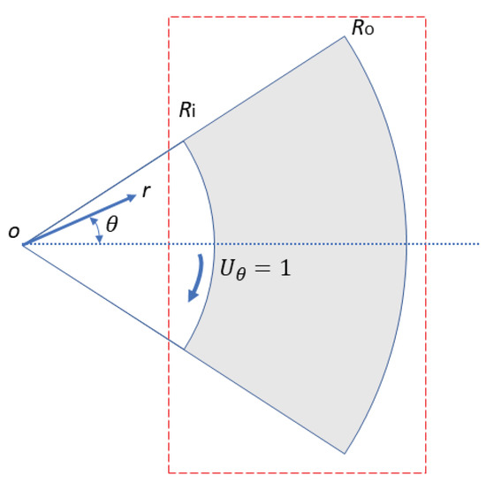 In order to validate the proposed hybrid method, the lid-driven polar cavity flow was here simulated, which was first studied both experimentally and numerically by Fuchs and Tillmark [40]. As shown in Figure 20, the flow was in an annular region defined by and . No-slip boundary conditions were applied at the four boundaries of the flow domain. For the rotating wall at , an azimuthal velocity of was prescribed. The dimensionless geometrical and physical parameters matching the experiments [40] were set as:
