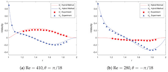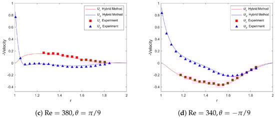 The flow domain was discretised with 59,501 velocity points and 1000 boundary points. In addition, inside the extended rectangular domain, but outside the four boundaries of the flow domain, 75,106 virtual points were generated. The pressure Poisson equation was solved in the extended rectangular domain using a regular grid of points. It is important to point out that, unlike the previous test cases, enforcing the divergence-free constraint outside the flow domain could be problematic in this case because a part of the solid body is moving. Hence, we chose to introduce a source/sink term outside the flow domain, which effectively turned the right-hand side of the Poisson equation into zero for the pressure points outside the flow domain. The dimensionless grid size was about 0.005. To ensure numerical stability, the dimensionless time step was set to , and the corresponding maximal CFL number was about 0.2. An initial condition of zero velocity was applied in the interior of the cavity. The flow was simulated for a sufficiently long time to ensure that the steady-state was reached. Figure 21 shows the radial () and azimuthal () velocity profiles along four radial lines , and for Re = 410, 280, 380, and 340, respectively, in comparison with the experimental data of Fuchs and Tillmark [40]. In all four cases, the simulation results obtained by the hybrid method were in good agreement with the experimental results, which also validated the proposed hybrid algorithm. As a side note, the simulation results here were also consistent with those obtained by the other numerical methods (for example, see Figure 18 of [21]).