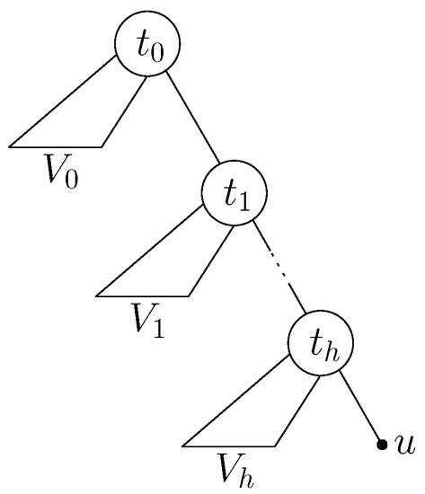 - if , the tree results from the tree of G after we have removed u from and have inserted the Formation of Figure 1(right) just above any of the nodes storing the set for (note that if , then the removal of u implies that the nodes storing for are linked to the node of the formation of Figure 1(right) storing if the formation is placed just above the node storing ; otherwise, they are linked to the node storing );