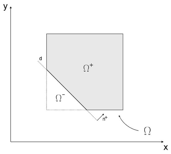 where  is the Jacobian matrix determinant. The integral in Equation (22) is calculated in (25), applying the standard scheme of the Gauss–Legendre numerical quadrature []. In (25),  stands for the number of Gauss–Legendre quadrature points and  stands for each point weight. It needs to be emphasised that the proposed algorithm is intended for integration over the entire domain  yielding the result of the integral over the subdomains , ,  and . Thus, the discontinuities equations have to be accurately defined, so that the unit vectors  point inwards. Additionally, it has to be noted that the discontinuities do not necessarily have to intersect  or one another (the proposed algorithm can handle all possible scenarios). The composition and the degree of the polynomials that can be precisely integrated using the suggested technique rely on specific requirements necessary to find the equivalent polynomial, as can be deduced from Refs. [,].