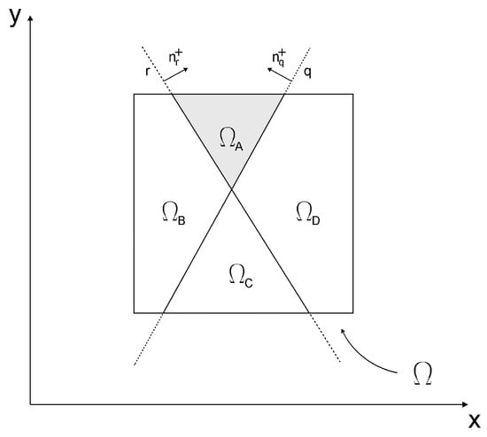 The case of multiple discontinuities within the same finite element is not uncommon in the context of fracture mechanics [], for instance when crack branching, kinking or junction occurs, both in linear and nonlinear materials [,,,,]. Consider the body  introduced in Section 3.2 and a quadrangular element of its mesh, , assuming it is divided into four portions by the discontinuity lines q and r, as illustrated in Figure 2. Define  as the partition obtained when the normal to each discontinuity points inwards. Starting from , the remaining partitions (,  and ) are defined counterclockwise by convention.