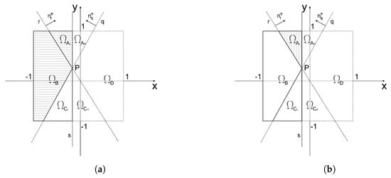 When the intersection point between the two discontinuities q and r is internal to the element domain, the above observation suggests the introduction of an auxiliary integration limit s along the abscissa axis of the element domain to eliminate indeterminacy. The line  contains the discontinuities intersection point P and is parallel to the vertical axis of the reference system. It should be noted that the introduction of the auxiliary integration limit s keeps the reduced integration domain rectangular, so that standard quadrature rules can be applied.