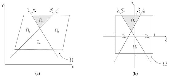The mathematical concept used in the proposed algorithm (as well as in the DD_EQP library) for this purpose is isoparametric mapping, which is commonly employed in the FEM [,]. Let  be a generic point in the parent reference system, corresponding to the point  in the global reference system. The mapping of  onto  is described by:
