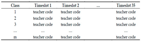 Each particle is represented as a matrix with as many rows as the number of classes determined by the input file and 35 columns. Each column represents a timeslot. In a typical Greek high school, the lessons take place in five days, from Monday to Friday, over seven hours a day at most. Thus, any group of seven consecutive timeslots corresponds to a working day of the week. At each cell of the particle (matrix), we place the value of “−1” when the corresponding timeslot of the class is vacant. Otherwise, we place an integer number, different from “−1”, representing the code of a teacher. In Figure 1, we present the particle’s structure.