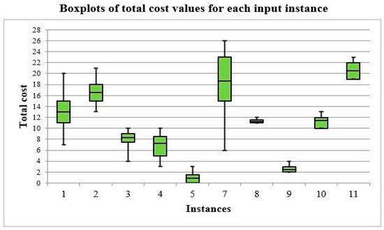 Box plots of total cost values for each input instance (after 30 Monte Carlo runs).