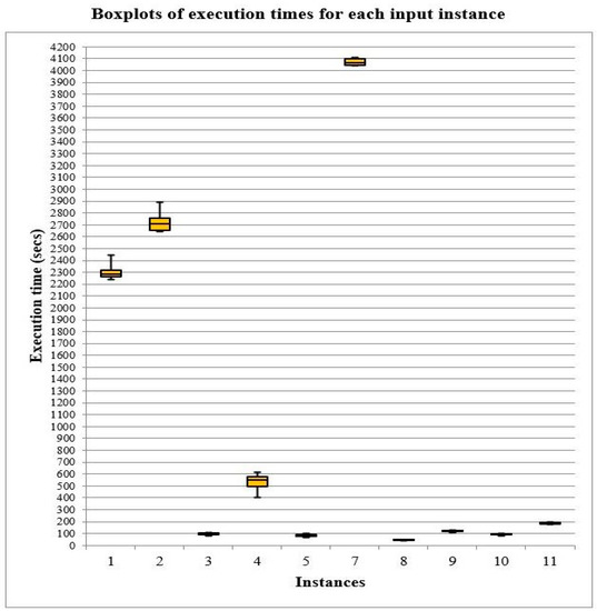 Box plots of execution times for each input instance (after 30 Monte Carlo runs).