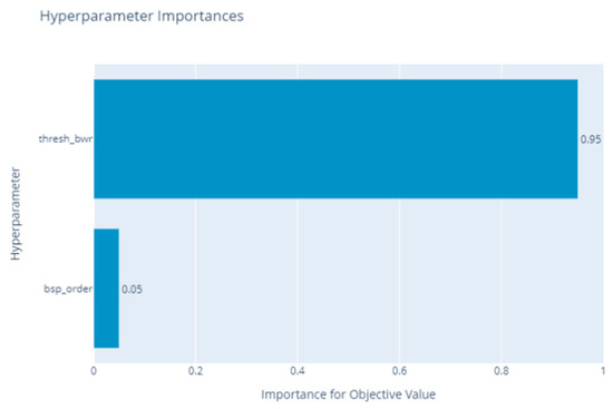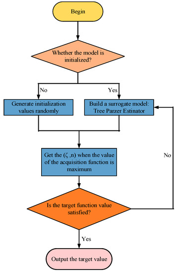 In this study, the bandwidth threshold and B-spline order were the independent variables of the BO model, and the flowchart of the Bayesian optimization was outlined as follows (see Figure 1). First, we determined whether the parameters of the model, and , were initialized, and if not, the initial parameters were generated randomly. If the parameters were initialized, the values were brought into the tree Parzer estimator surrogate model. Subsequently, it was judged whether the acquisition function reached its maximum value when given and . If the maximum value of the target function was satisfied, the value of the two parameters were output. If not, the values of the surrogate model parameters were updated until the requirements were met.