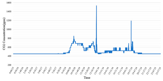 The CO2 concentration was analyzed after denoising the CO2 signals, which were obtained using pump-activated CO2 concentration detectors installed in offices and university classrooms. The CO2 signals were sampled at a frequency of 5 s and monitored continuously for 24 h. Figure 3 illustrates the CO2 signal from an regular-sized office accommodating approximately six to ten people. The detector measured the CO2 concentration at a height of 2.8 m in the room. The specifications used are listed in Table 1.