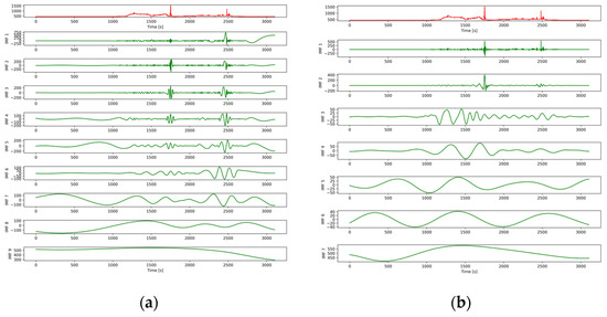 Decomposition results of the CO2 signal obtained by (a) EMD and (b) TVF-EMD.