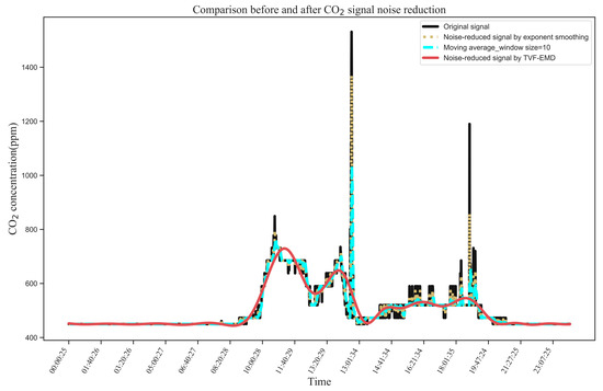 Signals contain rich characteristic information; thus, signal processing analysis is crucial in the development of natural sciences, particularly in environmental monitoring [1]. There is a relationship between the indoor carbon dioxide concentration and respiratory mucosal symptoms [2,3]; hence, it is essential to monitor and study carbon dioxide concentrations in various functional building spaces in real time. However, when there are sudden changes in background concentrations of CO2 or equipment sampling failures, the CO2-monitoring signal becomes noisy, making it difficult to distinguish important signal features from noise. Therefore, the noise cancellation of the CO2-monitoring signal is important.