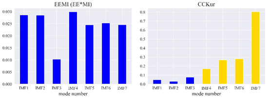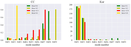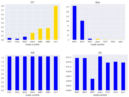 Different parameters affected the decomposition results to different degrees. The decomposition of the CO2 concentration signal and the effect of TVF-EMD parameters on the decomposition results are shown in Figure 8. The bandwidth threshold reached 0.95 in the decomposition results, indicating that the selection of the optimization index should be sensitive to the change in . Therefore, we analyzed the results of CC, Kur, MI, EE, EEMI, and under varying . As shown in Figure 9, when assumed values of 0.1, 0.2, and 0.31 (the optimal parameter), eight, nine, and seven IMFs were obtained by decomposition, respectively. When was at least four, two IMFs were obtained, indicating that mode aliasing and under-decomposition occurred. When increased from 0.1 to 0.31, the MI, EE, and EEMI indices of the IMFs did not change significantly, suggesting that these indices were insensitive to the variation in . The CC, Kur, and indices were sensitive to ; hence, they can be selected as indices for the best parameters. When , the sum of the indices of IMF1 to IMF9 was the largest, which indicates that can be regarded as the best optimization model. The results showed that (1) had to be at least 4 for mode aliasing and under-decomposition to occur; (2) , , and indices were sensitive to , whereas MI, EE, and EEMI indices were not; (3) the proposed index and objective function were effective; and (4) the value of 0.31 for was reasonable and correct.