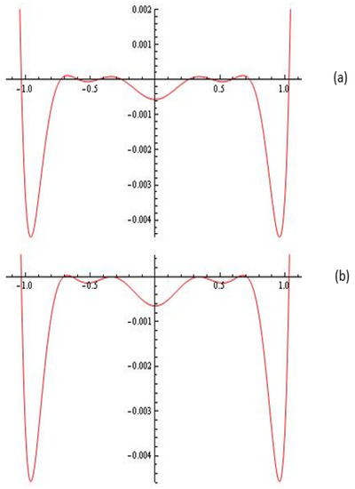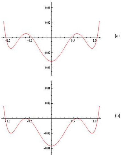 (a) The Melnikov polynomial for and (five limit cycles); (b) The Melnikov polynomial for and (simple limit cycles , , and limit cycle with multiplicity two).