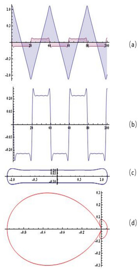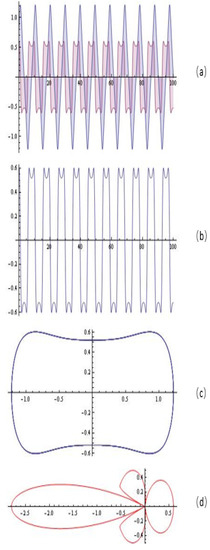 The simulations (system (8)) for , , , ; : (a) the solution of the system; (b) y-component of the solution; (c) the portrait; (d) emitting chart.