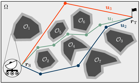 where denotes the length of the vector. Thus, is a discrete objective function and minimizes the number of TPs. There are three candidate solutions: (green curve), (blue), and (red) in Figure 1. These three candidate solutions have 5, 3, and 1 TPs, respectively, which results in DSV dimensions , 6, and 2, respectively. It should be noted that any other objectives could be added to the problem formulation (1), e.g., the maximization of a minimal distance of the considered path towards any of the obstacles. For the sake of clarity of the shown results, we stick to the two-objective formulation in this paper.