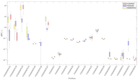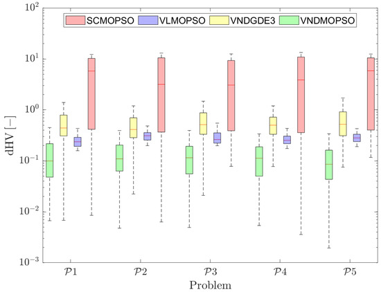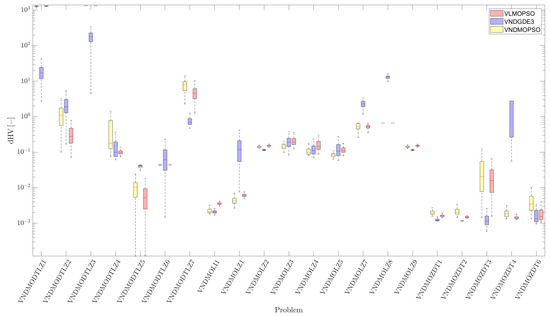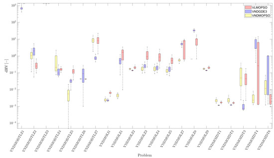 The results in form of boxplots of the metric are shown in Figure 3, Figure 4 and Figure 5. The results from 100 independent runs of individual algorithms were compared using the Wilcoxon’s ranked sum test. Please note that the test was performed at the significance level . The results of the Wilcoxon’s test comparing VNDMOPSO with VNDGDE3 and VNDMOPSO with VLMOPSO are summarized in Table 4.