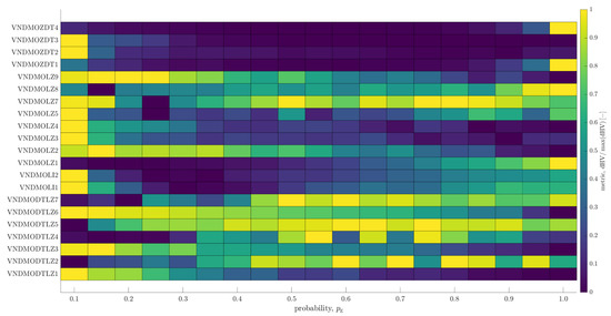 The influence of the on the quality of the solution found by VNDMOPSO is shown in Figure 7. There, the heat plots of the metric are shown for all the benchmark problems and values ranging from interval . Please note that the metric values are normalized according to obtained values for every individual benchmark problem so that they can be visualized in a single figure. From the results in Figure 7, it can be seen that, for more complex tasks such as those from the DTLZ family (taking into account the results in Figure 3, Figure 4 and Figure 5), VNDMOPSO converges better for . The algorithm converges best for less complex tasks such as ZDT1, ZDT4, and LZ1 for . Concerning the intended application (robot pathfinding, where we prefer a higher certainty of finding the correct solution over the convergence speed), we recommend a compromise value of .